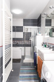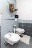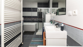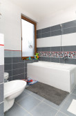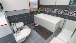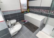Kúpeľňa ma vanu aj sprchovy kút, bidet, toaleta, sušička, práčka, podlahové kúrenie,
